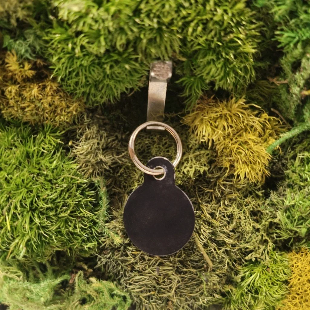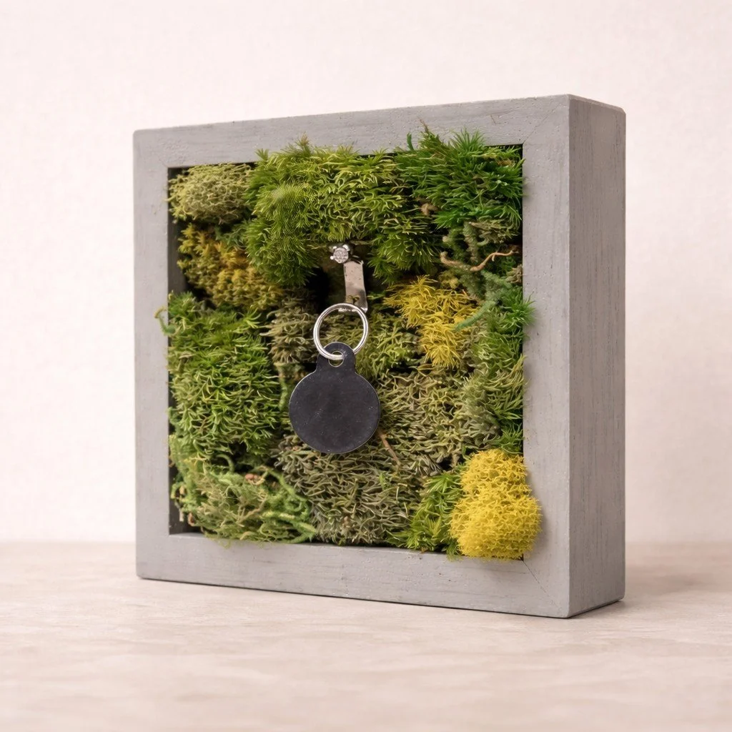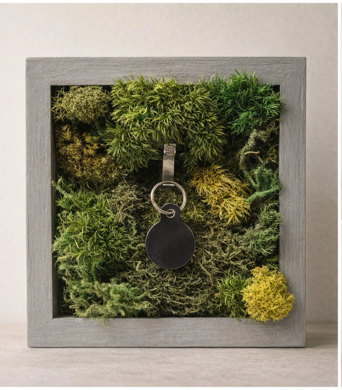 A small, grounded keepsake designed to hold a single pet tag within preserved moss and natural materials.
