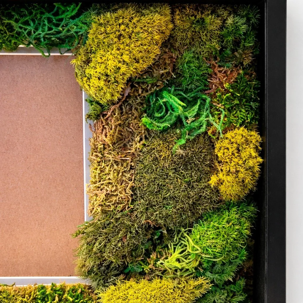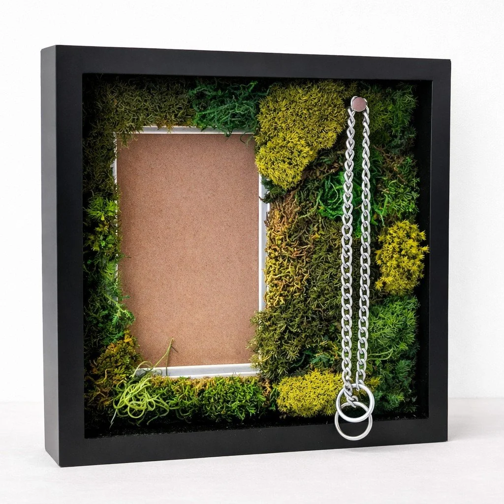 A deeper frame designed to display a collar alongside preserved moss and natural textures, honoring the shape, weight, and presence of a pet’s everyday companion.